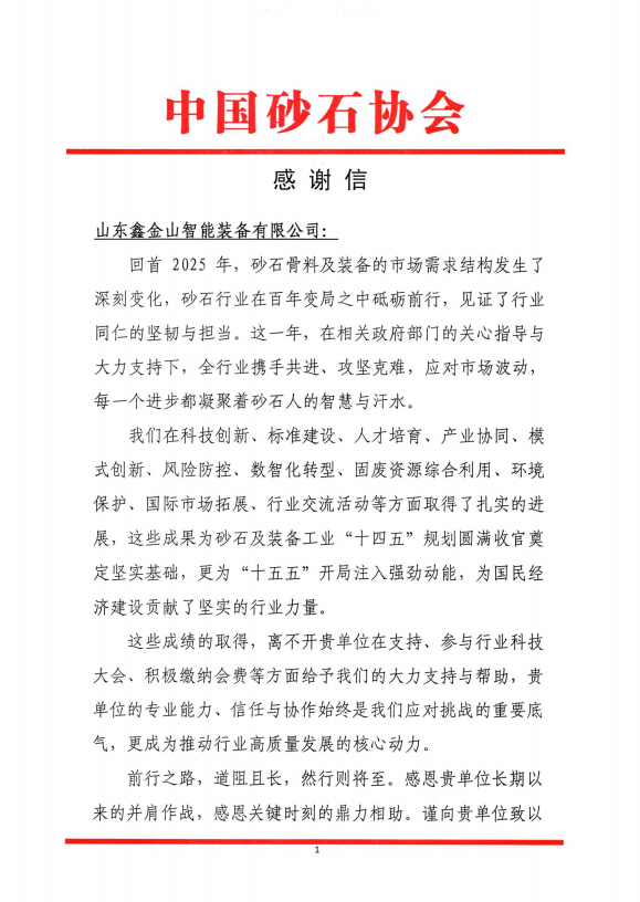 近日,山東鑫金山智能裝備有限公司收到中國砂石協會發來的感謝信。鑫金山對此致以誠摯謝意,這份認可既是對企業深耕行業的肯定,也是對全體員工的莫大鼓舞。