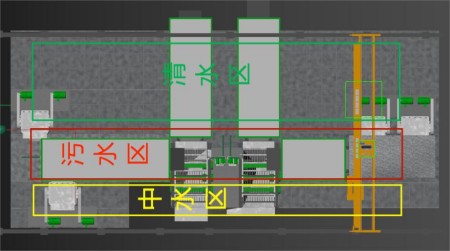 四合一集水平臺(tái)污水處理系統(tǒng),功能區(qū)域劃分,內(nèi)部循環(huán)處理, 中水回用,每噸砂石僅補(bǔ)充水0.02t。當(dāng)原料含泥量≤15%以內(nèi)不用絮凝劑。